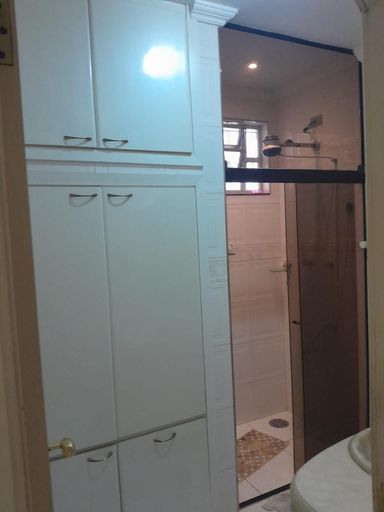 Banheiro social com armários e box de vidro até o teto